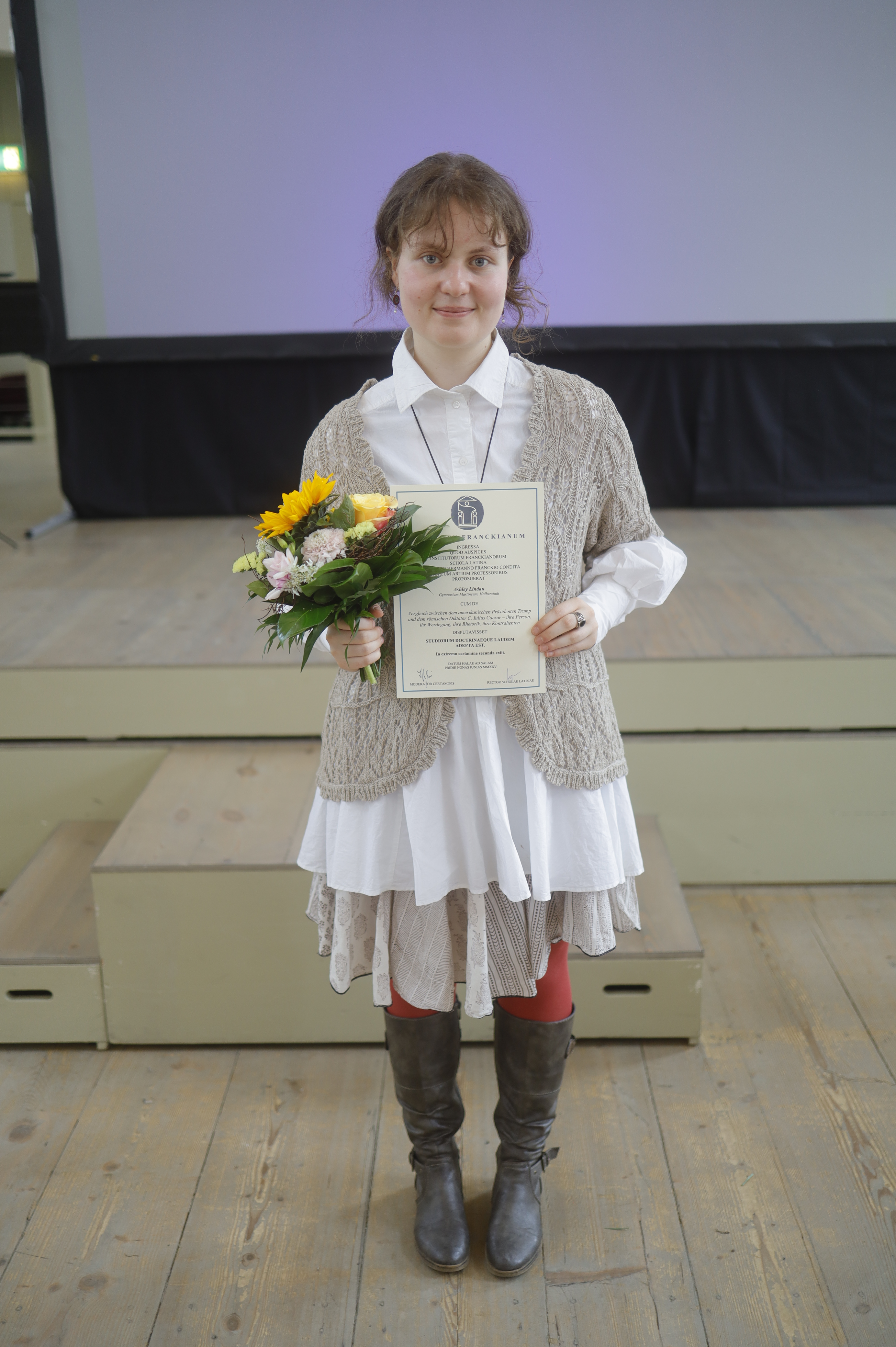 Der Preis der Elisabeth-Lebek-Stiftung und damit der zweite Platz ging an Ashley Lindau (Gymnasium Martineum, Halberstadt): sie verglich C. Iulius Caesar mit dem amerikanischen Präsidenten Donald John Trump und untersuchte dabei die beiden Personen, ihren Werdegang, ihre Rhetorik und ihre Kontrahenten in einem stets anschaulichen Vergleich. Dabei konnte man sich wirklich die Frage stellen, ob Geschichte sich nicht in manchen Details doch wiederholen kann – und ob wir, trotz unserem Wissen und unseren Kenntnissen, nicht immer noch charismatischen Persönlichkeiten verfallen können.